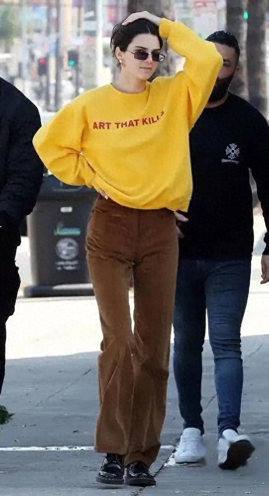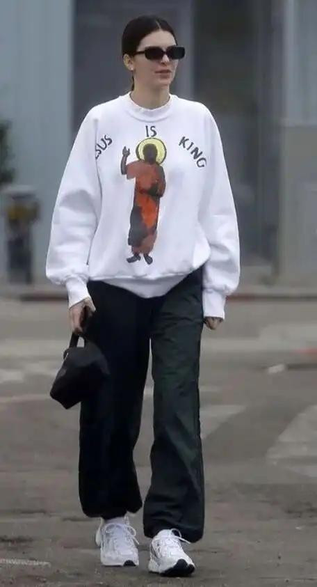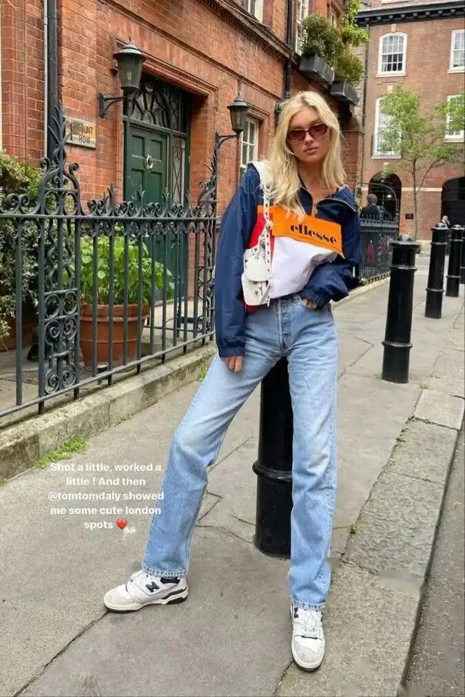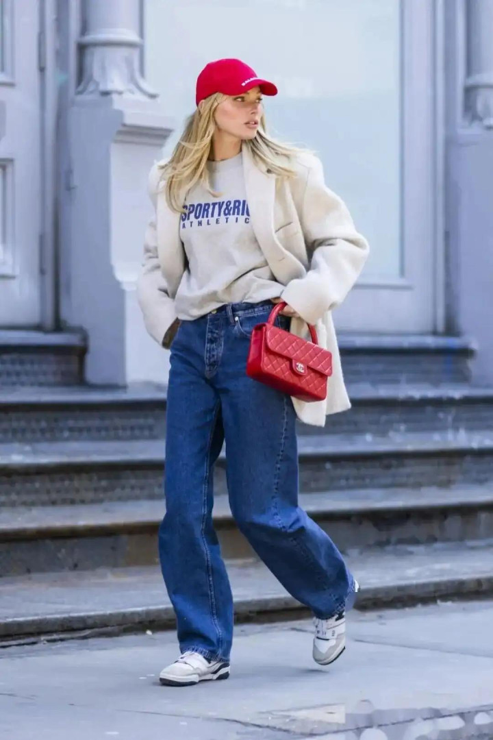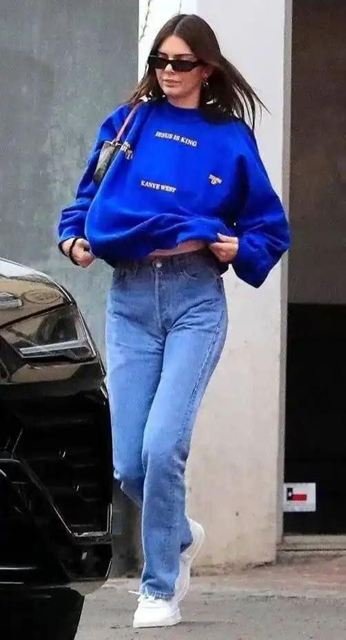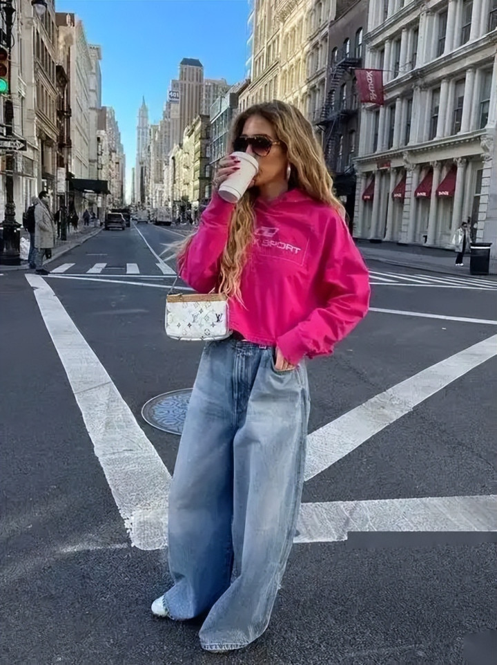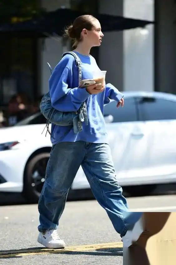 除了颜色的搭配,卫衣和牛仔裤的版型接管也大约对全体造型产生很大的影响。
