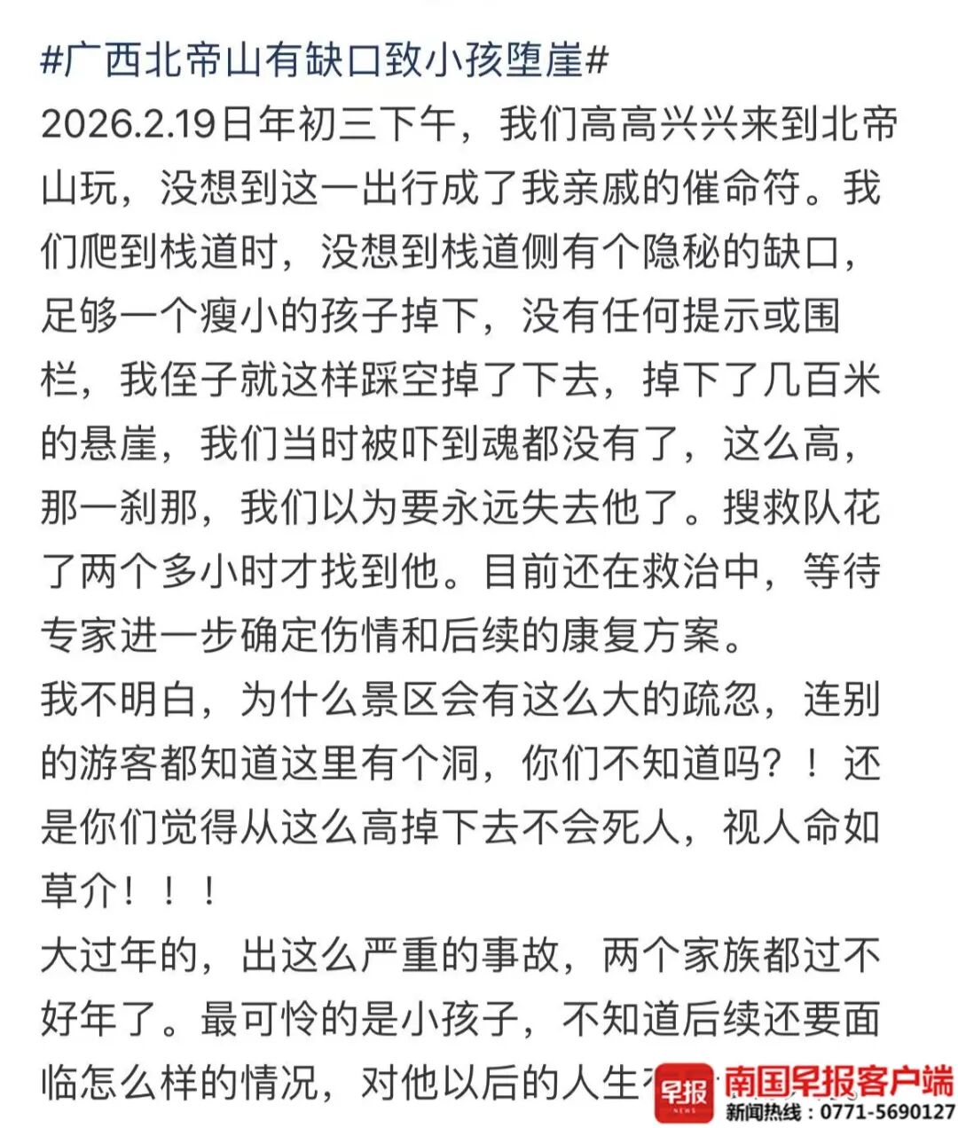 2月19日,贵港平南北帝山景区发生沿路坠崖事故,别称10岁男孩在绝壁栈谈游玩时,失慎从栈谈与山体间的一处空泛陨落,跌至数百米深的崖下。景区与支柱东谈主员遑急搜救,将孩子找到并送医救治。经初步诊断,男孩右腿骨折,其他部位受伤情况仍需众人进一步诊断评估。 男孩家属反应,19日下昼,一家东谈主来到北帝山景区游玩。当一转东谈主沿着绝壁栈谈精深行交运,孩子失慎走到栈谈边际,一脚踩到一个空泛坠崖。 ▲男孩家属在酬酢平台上发文的截图。 男孩家属以为,事发位置的空泛在栈谈和绝壁间,较为解除,从外不雅上很难察觉...